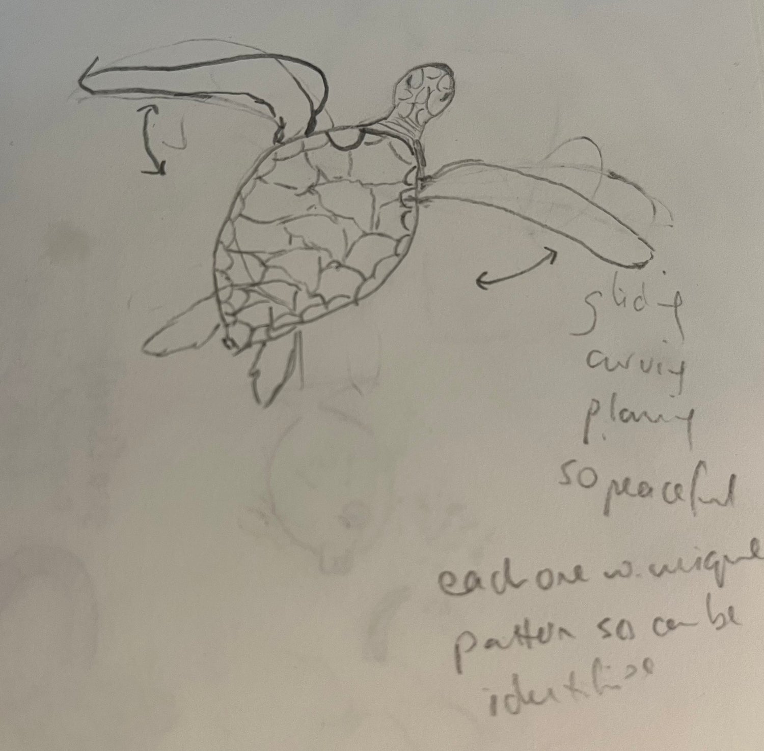 And the shape – it is taken from this hand drawing of mine, of a sea turtle that I saw on my very first scuba dive – and I’ve made it have a lovely organic texture so it is satisfying to feel. Each sea turtle has its own unique skin. Every time I touch the pendant I think of the sea turtle swimming so freely, with no idea of being watched.”