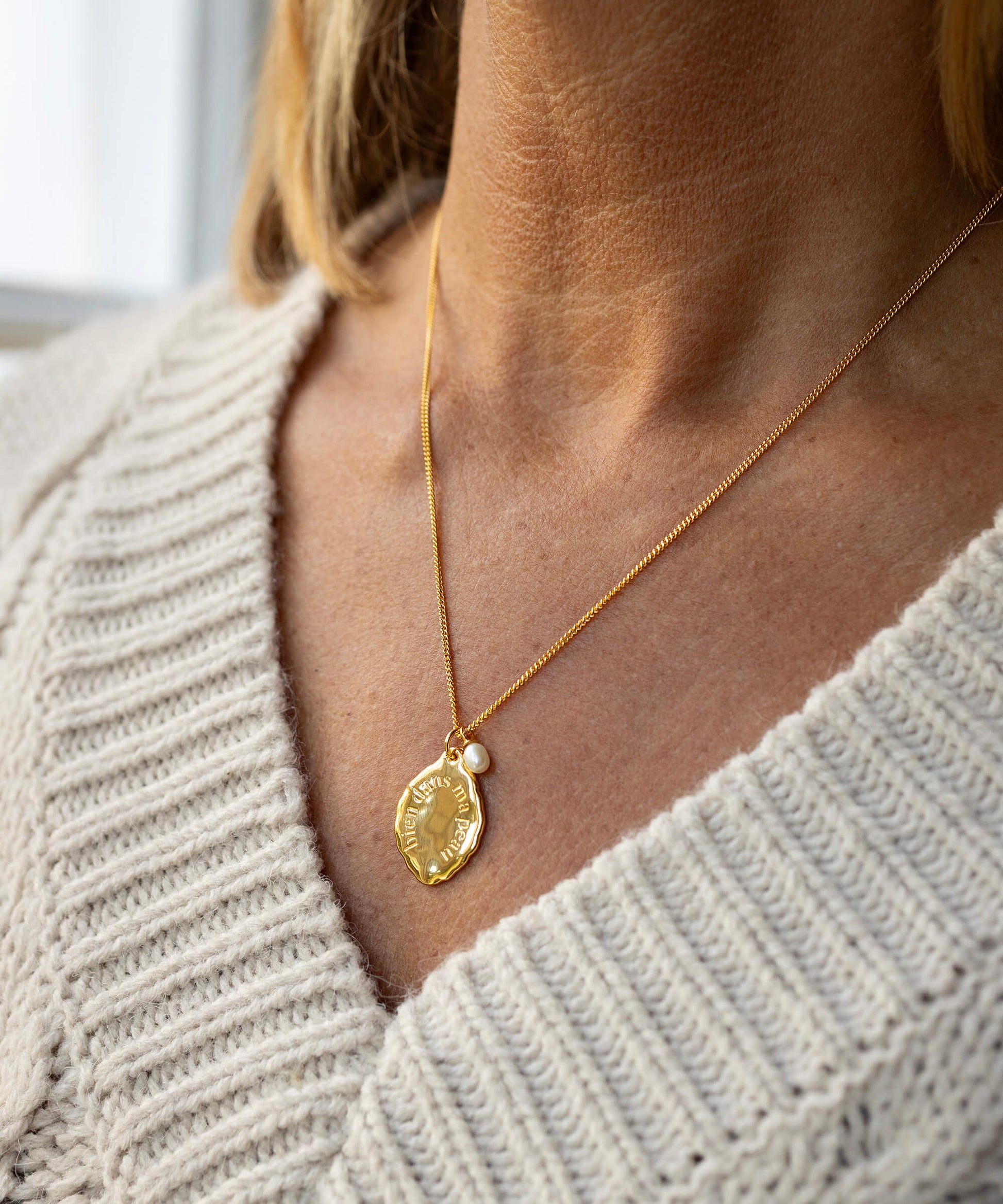 This18k gold plated pendant, paired with our freshwater pearl, makes the perfect empowering daily talisman necklace.