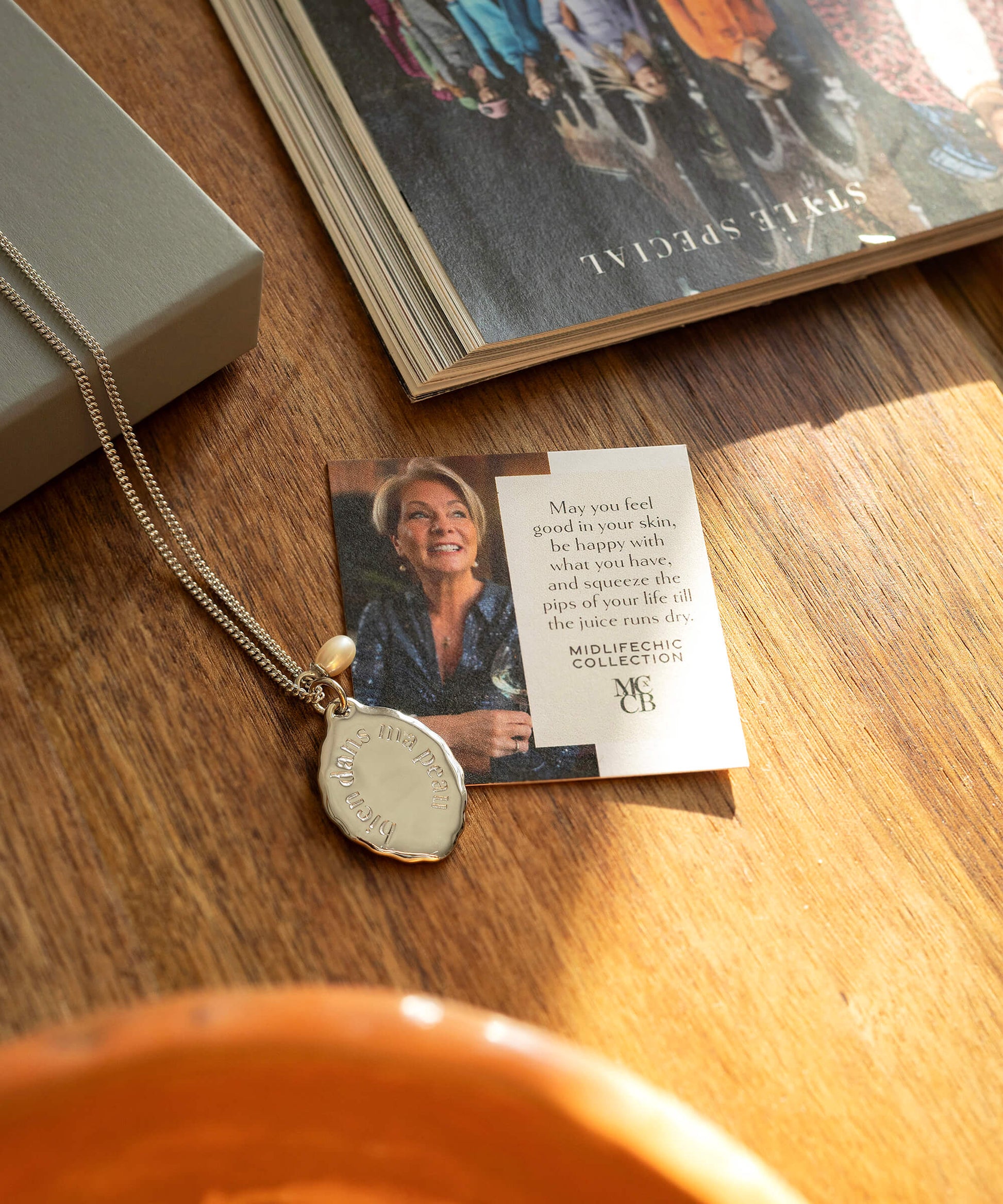 'Bien dans ma peau' - is a new mantra necklace, with a single pearl charm, designed in collaboration with style icon, and creator of the Midlifechic blog, Nikki Garnett. This French phrase translates to 'comfortable in my own skin', as Nikki says: "Too often we focus on what we’re not. I hope that this will remind you to feel at peace with exactly who you are - because you are so much more than just good enough."
