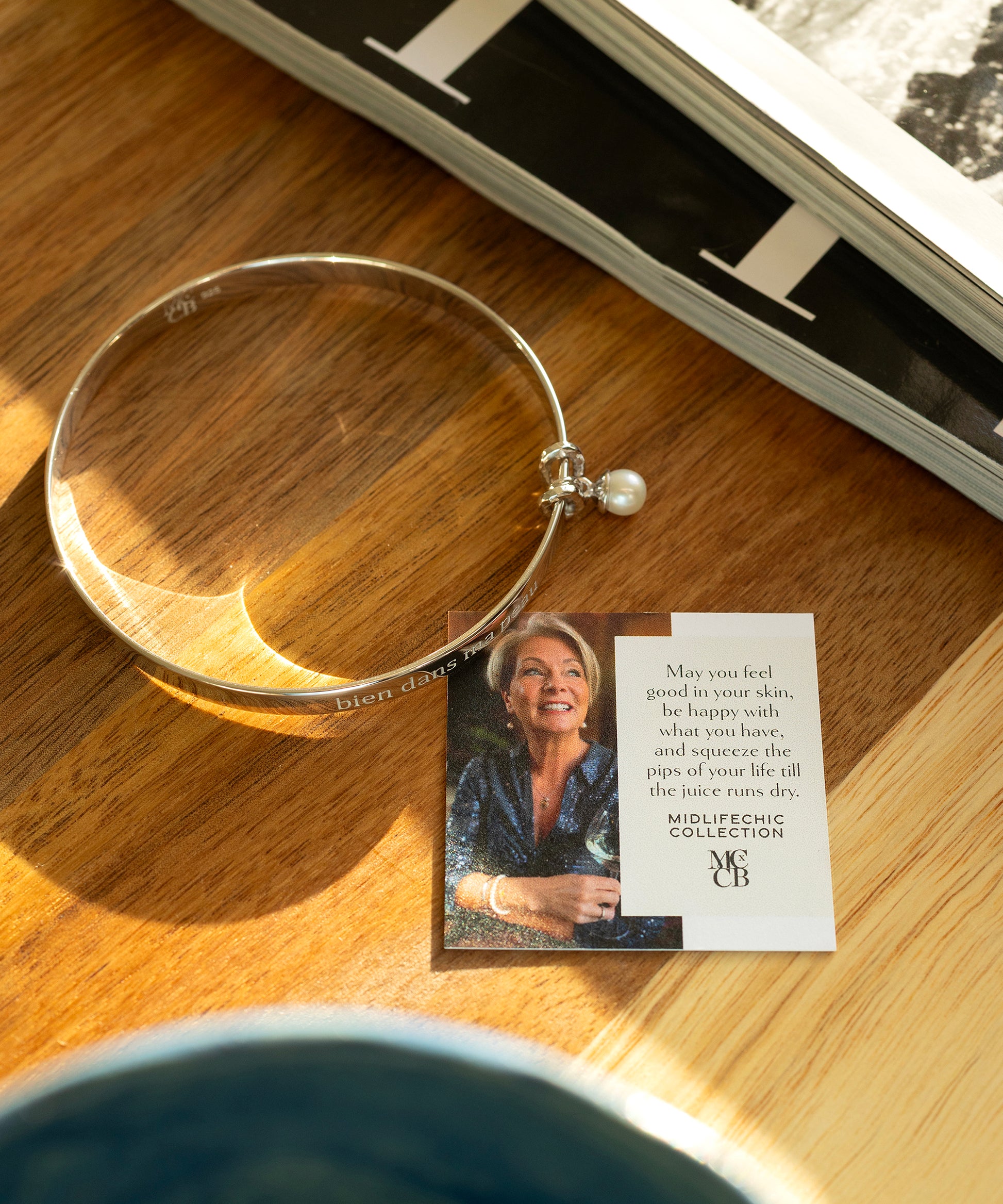 'Bien dans ma peau' - is a new mantra bangle, with a single pearl charm, designed in collaboration with style icon, and creator of the Midlifechic blog, Nikki Garnett. This French phrase translates to 'comfortable in my own skin', as Nikki says: "Too often we focus on what we’re not. I hope that this will remind you to feel at peace with exactly who you are - because you are so much more than just good enough."