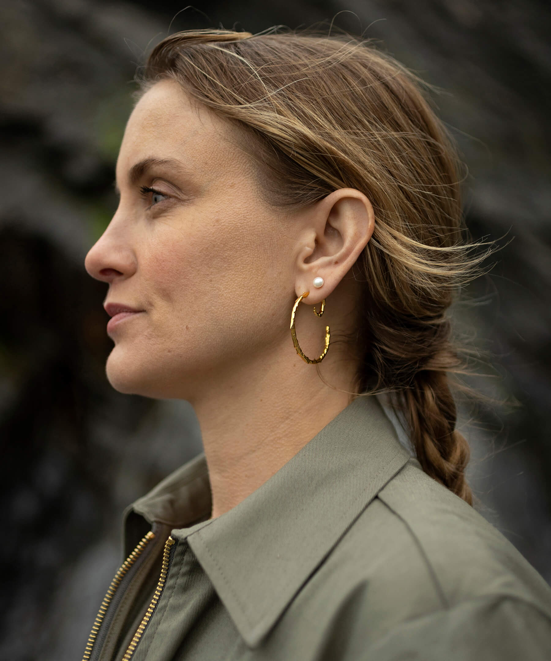 These stylish pearl and textured gold earrings, and gold ear jackets, give you two earrings in one as you can remove the gold ear jacket and wear the pearl stud on its own (it comes with a second butterfly). Inspired by the Icelandic landscape, and the raw beauty of pearls, these earrings would be a fabulous addition to any jewellery wardrobe. And offer great ear layering options. Hand crafted in 18k gold plated sterling silver and freshwater pearls this is a design to treasure forever.