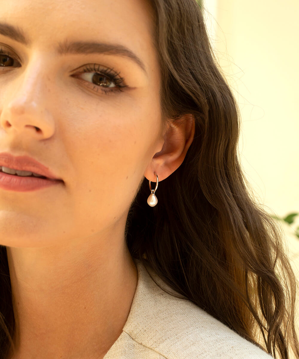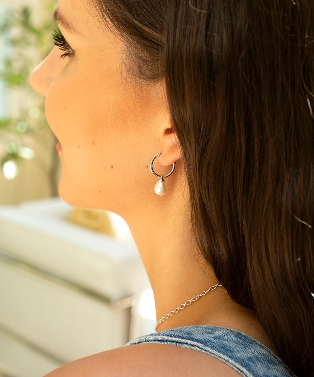 Handcrafted for everyday pearl wear, these sterling silver hoop earrings feature a beautiful teardrop-shaped freshwater pearl which can be removed to wear the hoops solo. The rich and adventurous history of these hand-selected pearls gives a depth to these popular hoop earrings. A link back to the past and, added to our modern design, a link ahead to the future.