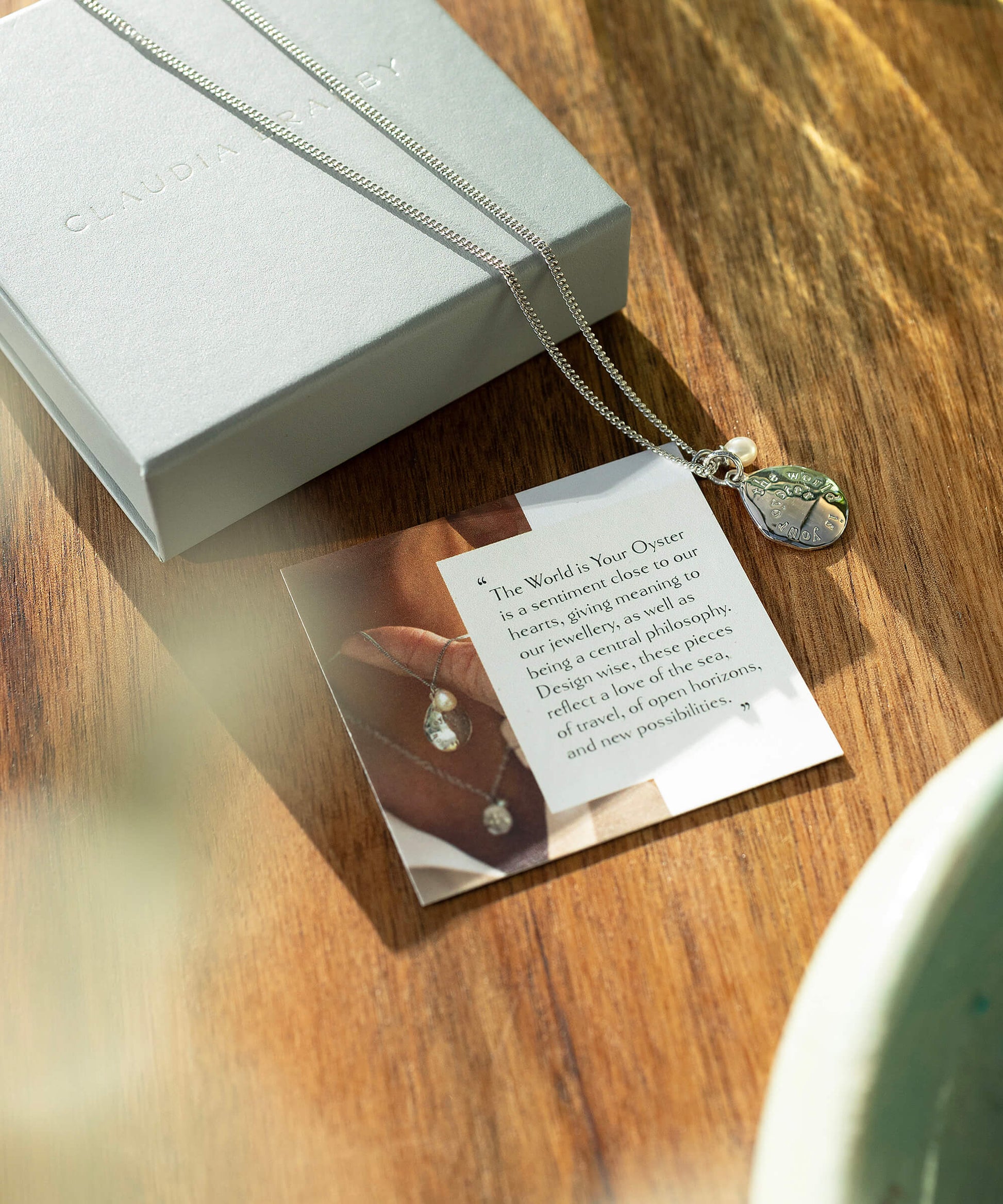 Claudia's signature, and iconic design, The World is Your Oyster, has become a bestseller for its easy-to-wear design and touching sentiment. The disc is cast from an oyster shell found on a beach near Claudia's birthplace in Australia. Much loved by our collectors this special necklace can be worn on its own or layered. The adjustable height allows this necklace to be worn as a choker as well as at a more regular length. As one of our most gifted pearl pieces, The World is Your Oyster Micro Necklace also features a thoughtful card, which details the meaning behind the design (pictured left).