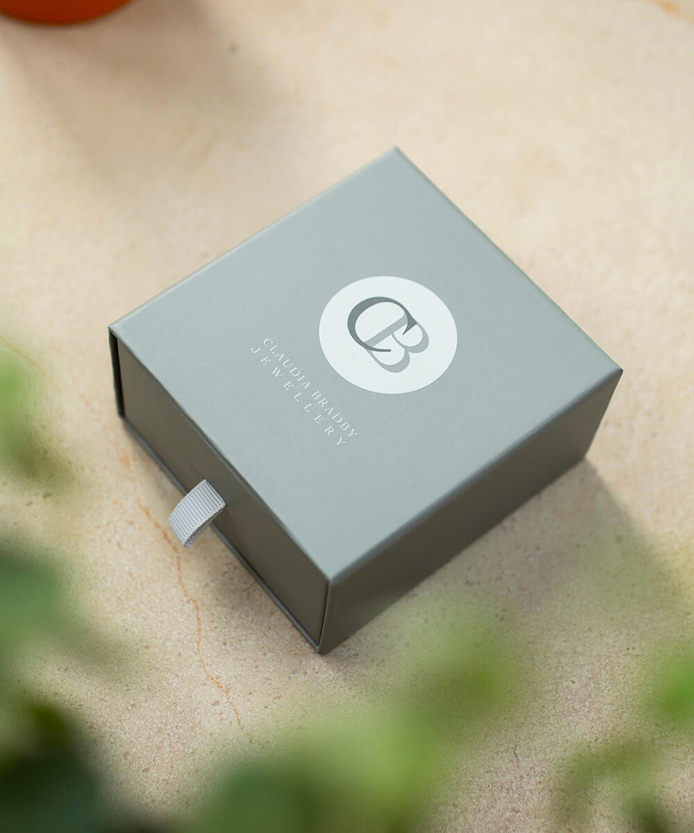 Every piece of jewellery is accompanied by a fully recyclable, luxury CB box, and is carefully placed in our new organic cotton pouch designed by Claudia for Anti-Tangle travel.